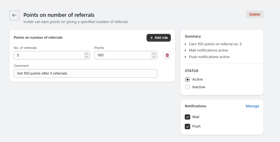 In this setup, the inviter earns points after the receiver places their 5th order. The second rule is mandatory and is used to define what happens after that point. By setting zero points from order 6 onwards, brands can clearly stop rewards beyond a specific order milestone, keeping referral rewards controlled and intentional.