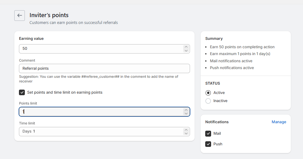 You can easily configure inviter referral points in Flits admin. The inviter earns a fixed number of points for each successful referral, with a points limit in place to prevent misuse and keep the program controlled.